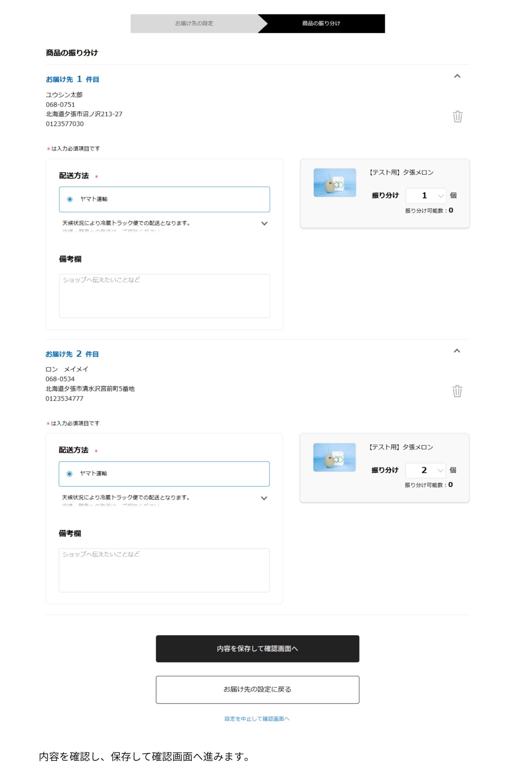 どのご住所に、どの商品を何個配送するかをご選択ください。